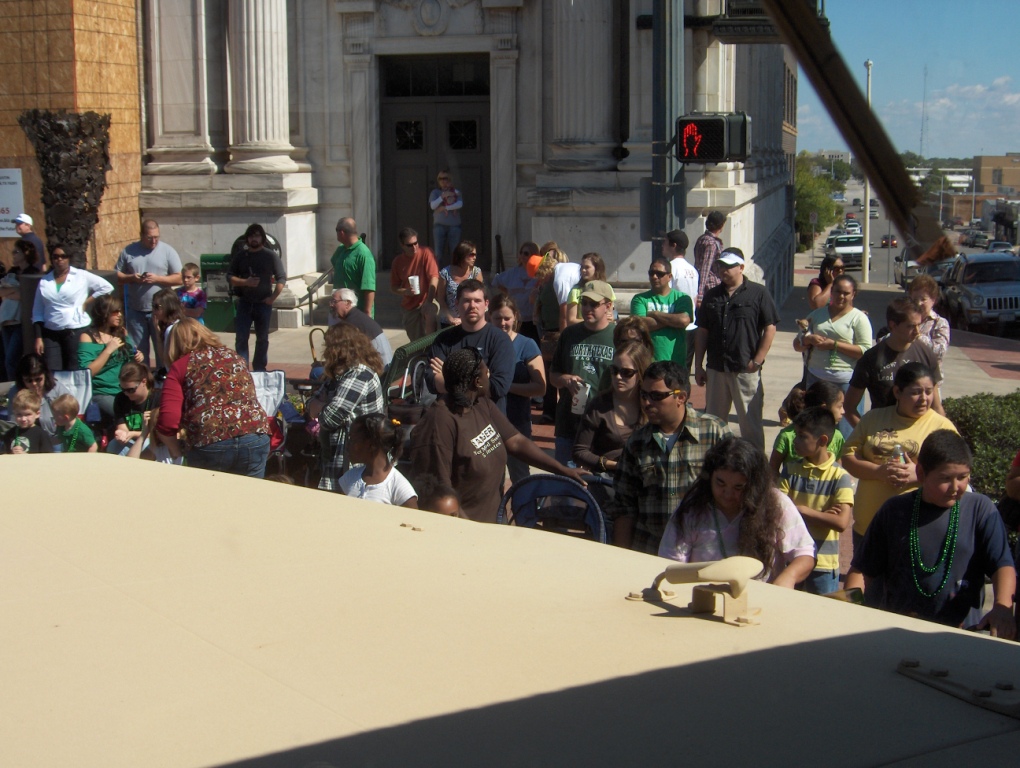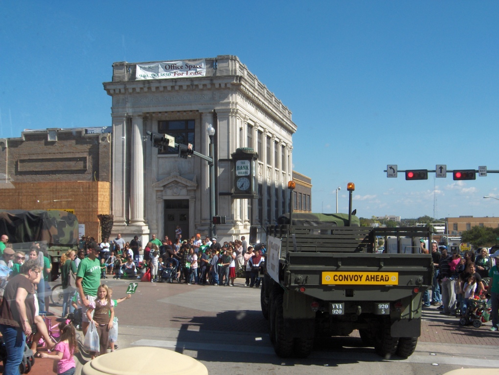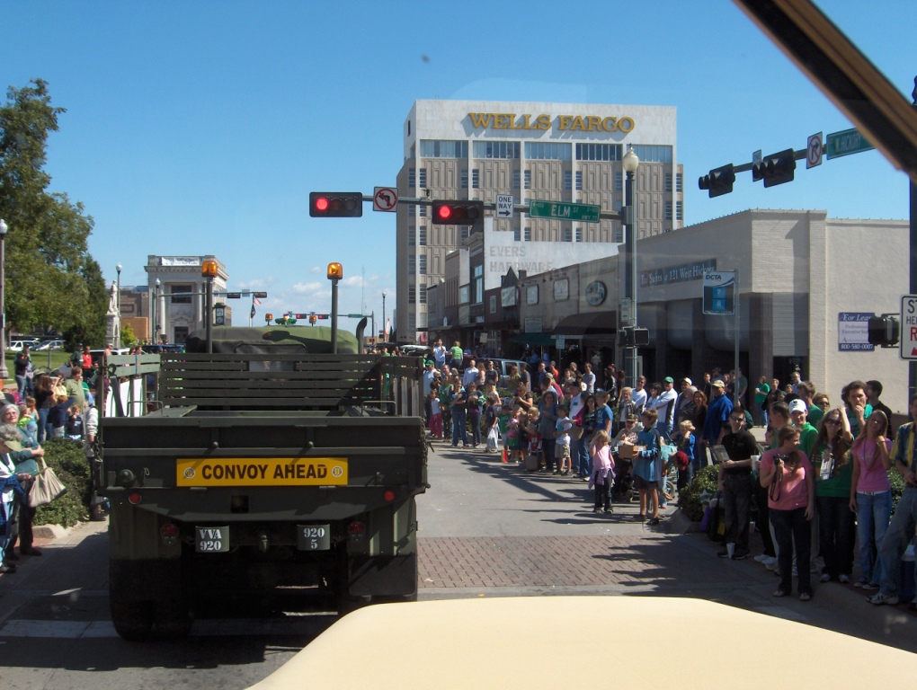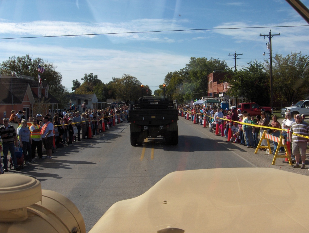 This is the view from the cab during the parade following my friends M35A2C (deuce and a half). This picture provides a sense of the M818 height. Note the crowd and the gorgeous Texas fall weather. It was almost hot on this October day. Small town U.S.A. I love it!!! An interesting note about the picture below.. the old brick buildings were at one time on both sides of the street, until a tornado wiped clean the brick buildings formerly on the left.
