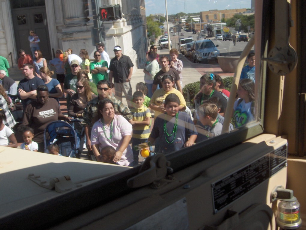 Does anyone know her?...The one in the UNT shirt. Wow! She is cute! Army truck ride? ...but leave your dog with your friend, please. In some parades, the crowd is not controlled well. As you will see, sometimes it becomes too close to the viewers and I must especially careful with the truck and kids. I never throw candy, as I don't want the kids near the wheels of the massive truck. These parents clearly do not do a good job of controlling their children. I proceed very slow and easy with liberal use of the horn in situations such as this. That's all for the M818. One awesome piece of military history. This Web Page Last Updated by My Truck is Bigger Than Yours WebMaster 03/05/10 |
