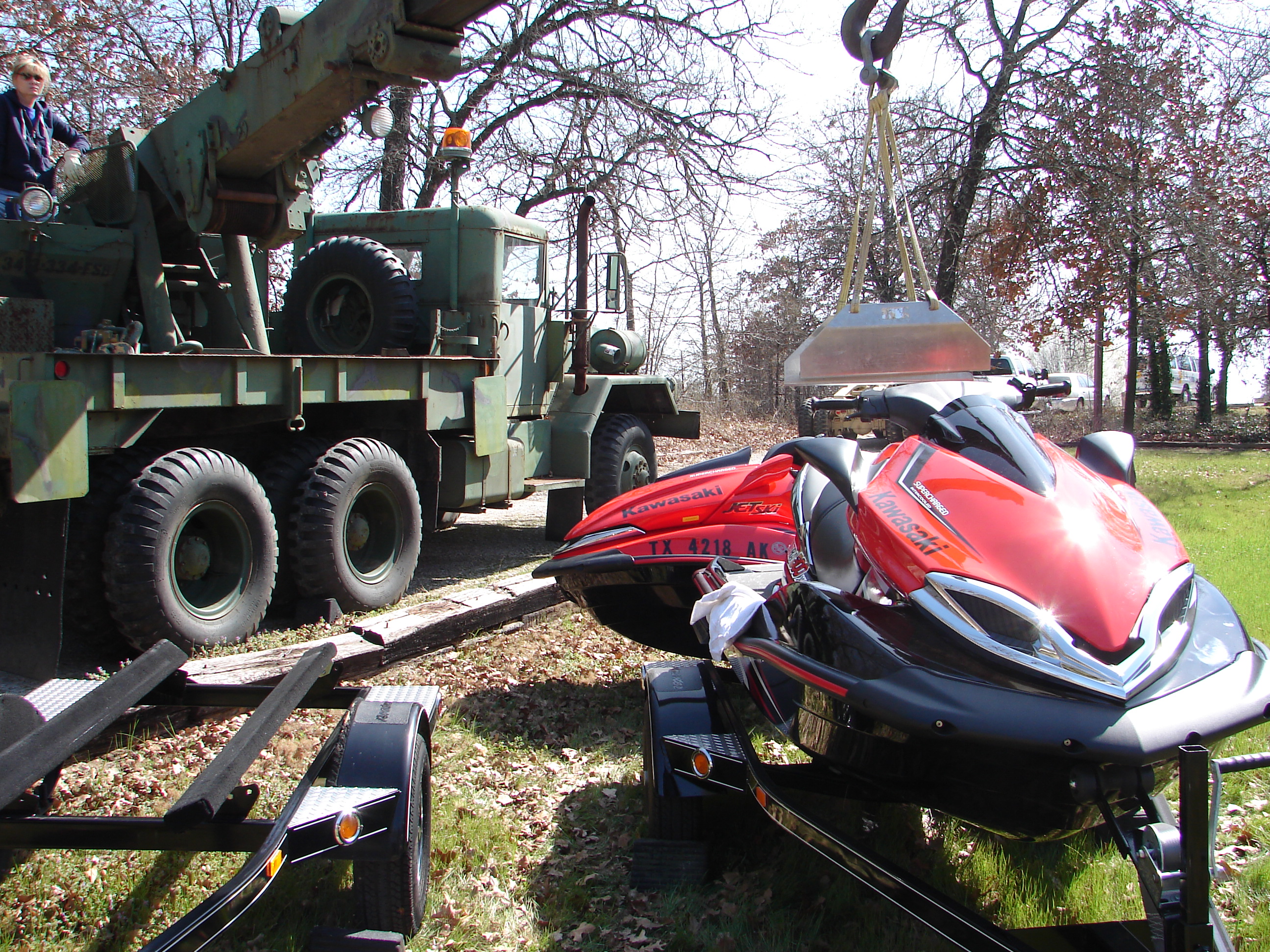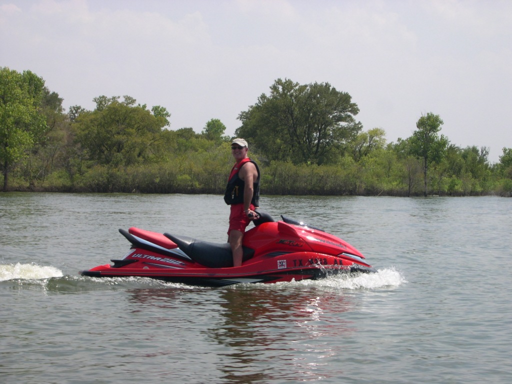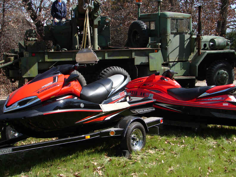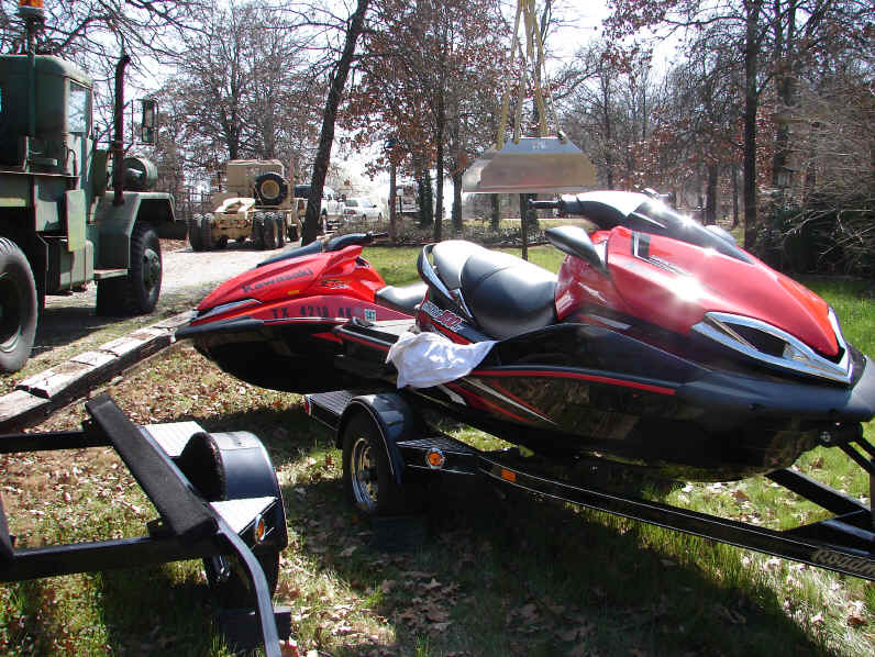 The Jet Ski switch-a-roo begins... changing trailers has never been so easy... The M543A2 is handy for yard work..... Note the partial fleet line-up... The world's best helper.... Click here to see a movie of the 300X in action!!! Be patient! This is a 26meg movie, so it will take time to load. This was downwind with the rollers on Lake Looneyville, Summer, 2011. Press your back button when finished. Also, check-out my Facebook page for multiple self-portrait movies of Ultra 300X action!!! ******************************************************************************************************************************************************* Okay, here is the old write-up on the 250X... This is the bad boy of personal water craft. The most powerful stock personal watercraft ever produced [Updated 2008: Sea Do has announced a 255 hp machine. We all know 255 Sea Do hp equates to a mere 50 Kawasaki hp. I can't wait to line-up against one of those. Latest update 2009: Kawasaki kicks butt again, by unleashing the 260 horsepower 260X. Maybe there is one in my future! ]. I had owned my 1997 Kawasaki 1100 STX for ten years and 349 running hours and a 1989 Kawasaki X-2 before that. The 1100 STX was a great machine. It provided my children and me hours and hours of reliable enjoyment. When Kawasaki introduced the Ultra 250X, I just had to see one, but the ads arrived well before any actual units. The first opportunity I had to view one in person was at the Dallas Boat Show in February, 2007. The good news was that while a totally new machine, Kawasaki kept a few familiar features. It looked and felt like the Kawasaki's I have enjoyed over the years. I placed my order soon after. Although mine took six weeks to arrive at the dealer, it was well worth the wait. Believe it or not, getting a new product in from a dealer without a mark or scratch is a tough challenge. It took two 1100 STX's to find one not marked. I was lucky in the Ultra 250X, as it was not too bad. Call me strange, but if I'm writing out a huge check for a toy, I want it in mint condition. Okay, a few pictures and comments.