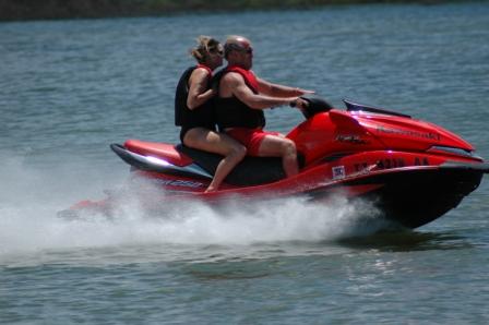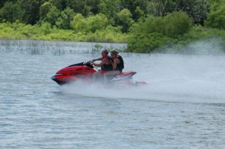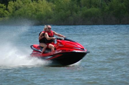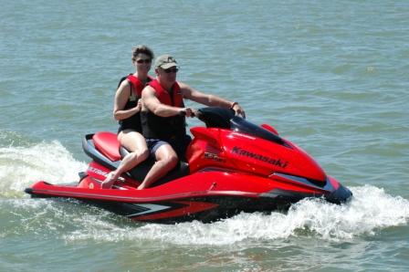 Another good HAMMER shot. If you look close, there is plenty of throttle left to squeeze, yet my face is rather flattened. Rounding corners it feels like it is on rails. Kawasaki Engineers did great with the new design that leans into the corner, like a motorcycle. 'Love the telltale cooling water stream on the starboard side indicating all is well in the 250 HORSEPOWER department. This machine is truly awesome! Hang on Becky, Hang on! Did I mention 250 horsepower?